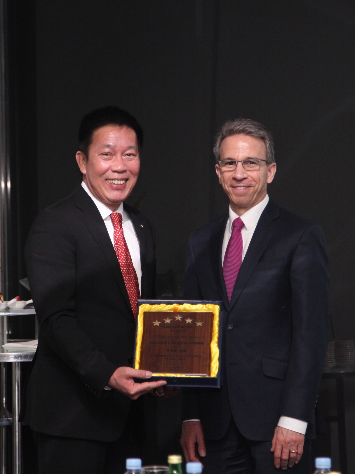 利星行機械和華北利星行機械作為卡特彼勒在中國區的兩家獨立代理商,其管理層也共同參加了與卡特彼勒的業務溝通會議,分別介紹了兩家代理商在不同代理區域的組織架構、人員發展、業務成長以及共同實現2020愿景的戰略規劃。會上,利星行集團董事局主席丹斯里劉楚群代表利星行機械接收了卡特彼勒首席執行官安博駿頒發的獎杯,表彰利星行機械對卡特彼勒挖掘機在華銷售的巨大貢獻。同時,安博駿也代表卡特彼勒向利星行機械集團首席執行官傅耀生頒發了“卡特彼勒5星級污染控制車間”獎牌,這是利星行機械自2014年以來連續4年在車間污染控制管理上獲得的榮譽和認證。