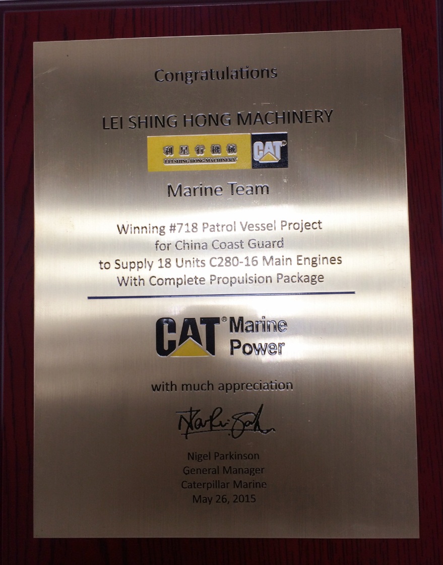 2015年5月26日,卡特彼勒船舶部董事總經(jīng)理Nigel Parkinson及亞太區(qū)銷(xiāo)售經(jīng)理陳耀明先生帶領(lǐng)其團(tuán)隊(duì)成員到訪利星行機(jī)械發(fā)動(dòng)機(jī)事業(yè)部。為了表彰利星行機(jī)械船機(jī)組在中國(guó)政府船市場(chǎng)中取得如此傲人的佳績(jī),Nigel Parkinson先生向利星行機(jī)械船機(jī)組銷(xiāo)售總經(jīng)理洪波先生頒發(fā)了榮譽(yù)獎(jiǎng)牌,并對(duì)該項(xiàng)目團(tuán)隊(duì)成員做出的貢獻(xiàn)與努力給予了高度的評(píng)價(jià)和肯定。